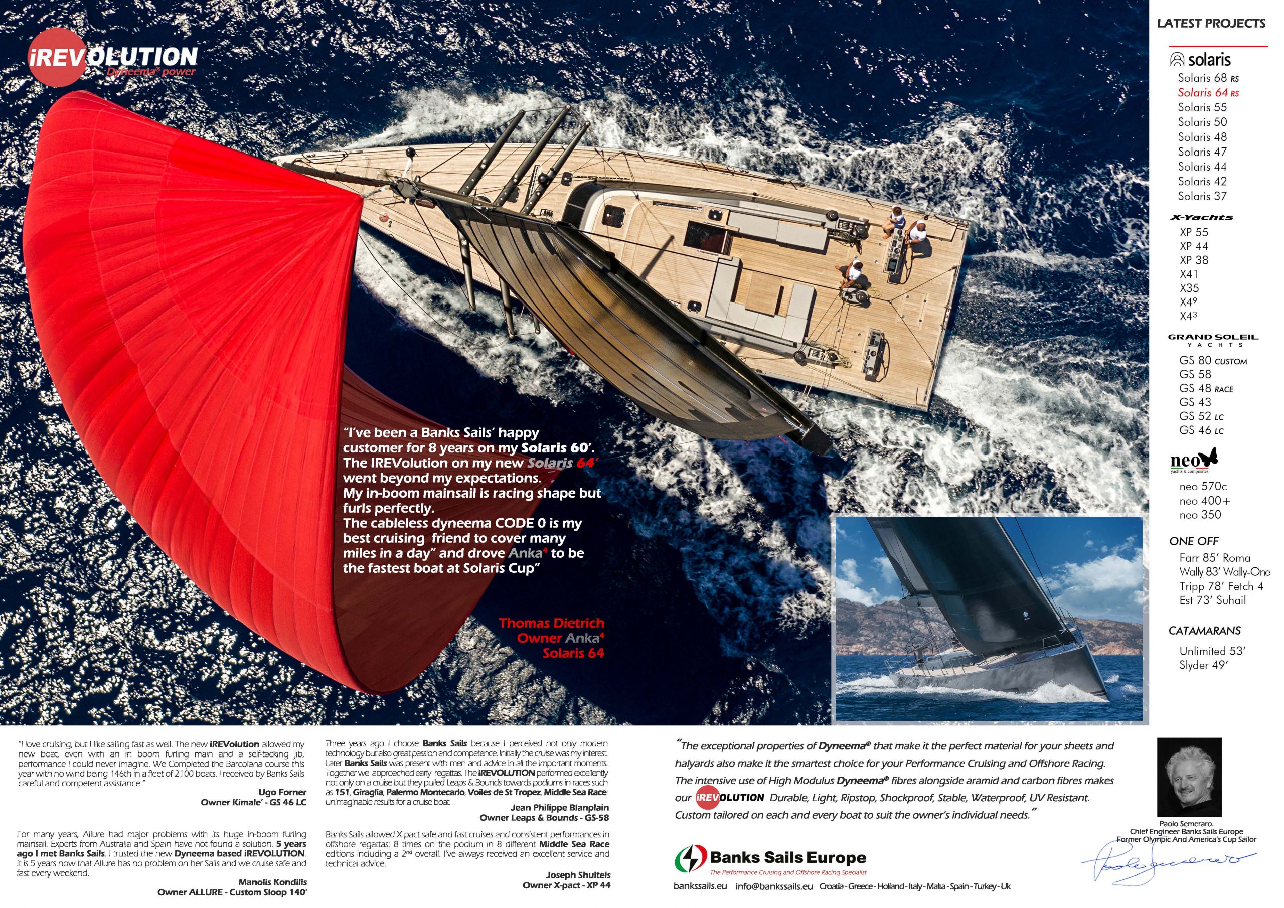 “The exceptional properties of Dyneema that make it the perfect material for your sheets and halyard also make it the smartest choice for your Performance Cruising and Offshore Racing. The intensive use of High Modulus Dyneema fibres alongside aramid and carbon fibres makes our iREVolution Durable, Light, Ripstop, Shockproof, Stable, Waterproof, UV Resistant. Custom-tailored on each and every boat to suit the owner’s individual needs.”