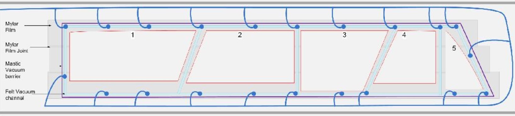 - Second skin lay down and vacuum application: powerful vacuum pumps suck the air out of the two sealed skins on an extra-flat glass floorensuring an excellent vacuum depression.